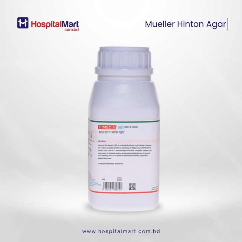 Origin: IndiaMueller Hinton Agar M173 Intended Use: Recommended for determination of susceptibility of microorganisms to antimicrobial agents isolated from clinical samples. Composition** Ingredients Gms / Litre HM infusion B from # 300.000 Acicase ## 17.500 Starch 1.500 Agar 17.000 Final pH ( at 25°C) 7.3±0.1 **Formula adjusted, standardized to suit performance parameters